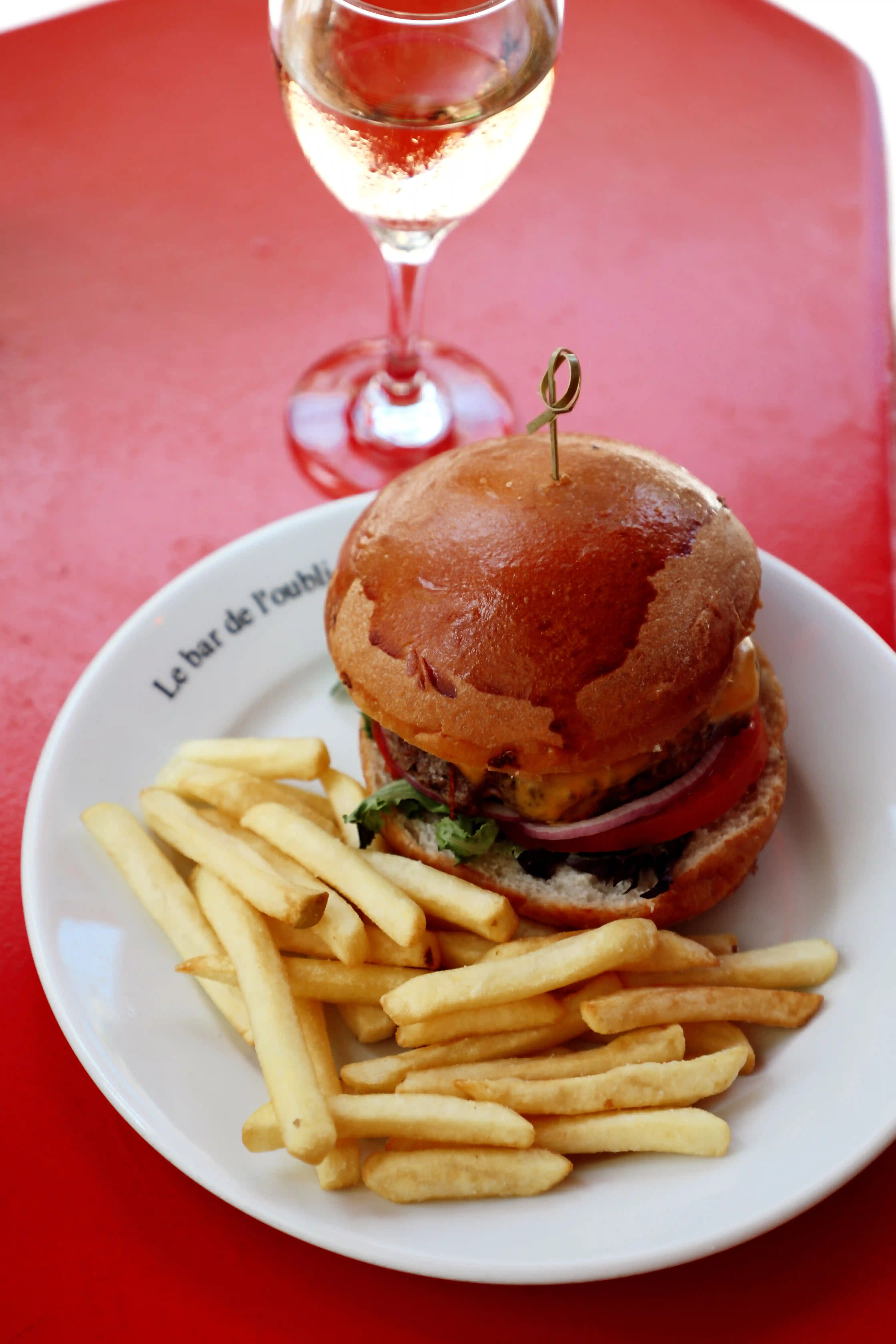 Pain boulanger, impossible steak, tomate, oignon, cornichon, salade, sauce tomate maison, frite
