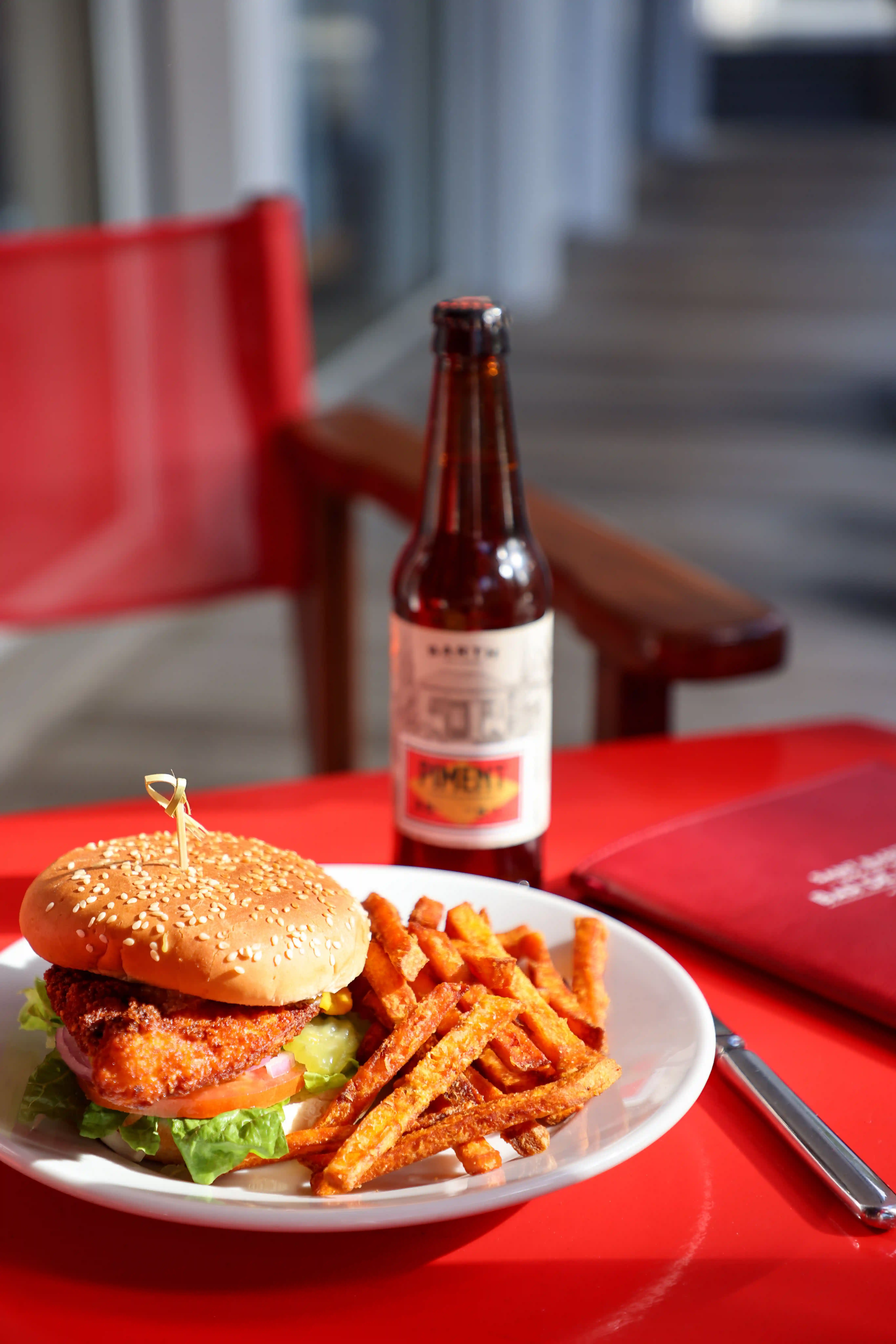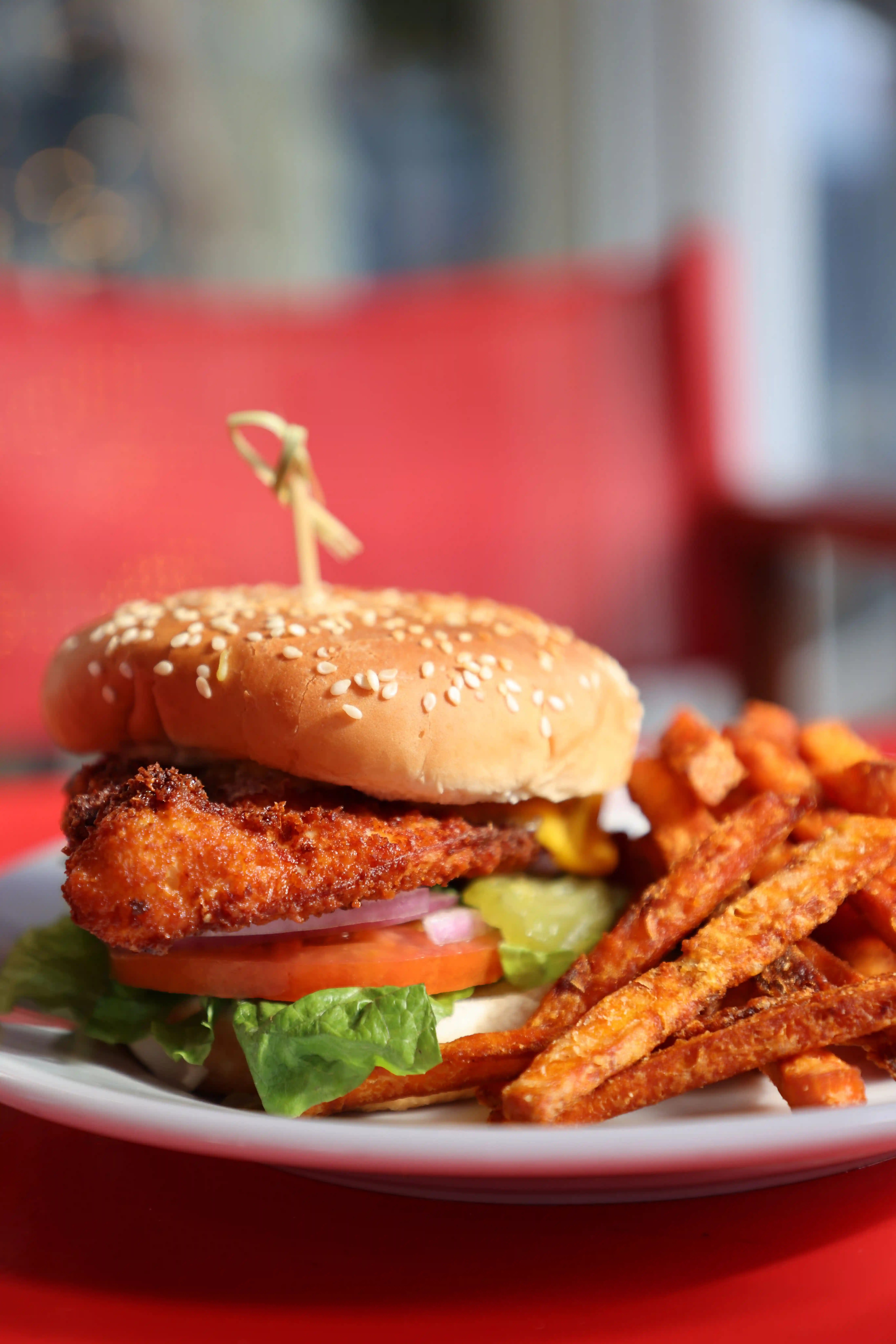 Pain boulanger, poulet pané maison, cheddar, cornichon, tomate, oignon, salade, sauce cocktail maison, frite